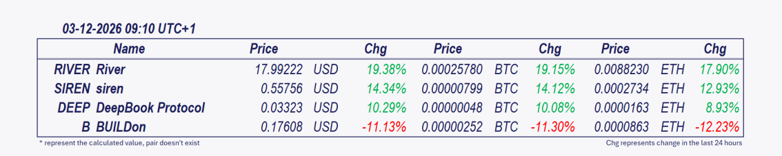 #### 過去24時間で最も動いたトークンとコイン:☀️ **9:00 – モーニングパルス:抵抗線を超えた失敗後の回復試行 –** **本日のトップ・ムーバー** * **RiverとSiren:** これらの暗号資産は過去24時間で最も好調で、**River**は深夜以来の暗号市場で最も大きな日中の上昇を記録し、30.34%上昇しました。💡*強気の勢い RIVERの急騰は、アルトコインのローテーションの好例であり、取引量も堅調です。注目ポイント:アルトコインシーズン指数が今後48時間で上昇トレンドを維持し、RIVERのような資産により多くの資金が流入するかどうか。***概要:** 過去24時間で暗号資産市場は上昇の拡大から調整局面へと移行しました。ブルーチップは一時、重要な6.68の抵抗ゾーンに挑戦しましたが、持続せず、市場は夜間に下落しながらも欧州朝に安定しました。夜間の弱さは意味のあるものでしたが、最新の反発は売り手が完全にコントロールを取り戻していないことを示しています。🔍 **市場見通し:** この動きは上昇の継続失敗を反映しており、新たな下落ではなく調整局面です。抵抗を試した後、市場の勢いは失われましたが、下落は秩序立っており、押し目買いが入っています。これは、内部的にまだ修復中の市場を示し、買い手は弱さを守ろうとしていますが、明確な上昇解決にはまだ力不足です。🧭 **戦略的見解:** 現在の局面は、より広範な回復構造内での調整的な後退です。次の動きの可能性:最近の夜間の底値を維持しながら、横ばいの調整と緩やかな反発傾向を継続すること。1. **NWST1100 – 総合市場指数**:暗号市場のベンチマークであり、デジタル資産経済全体の指標。時価総額、流動性、DAOQEの質を基に上位1,100資産を追跡。過去24時間で0.46%回復。2. **NWSBCT指数(ブルーチップ用)**:リアルタイム取引可能なベンチマークNWSBCT(ブルーチップのサブセットを用いた広範な市場の模倣)。日足チャートでは、NWSBCTは夜間の安値から反発していますが、0.236レベルの6.68付近を下回っています。これは、市場がセッションの最も弱い部分から改善したことを示す一方、より強力な推進力が必要です。📍 9:00 CET時点では6.58付近で取引されています。3. **2100NEWS指数**:さまざまなトークンとコインのパフォーマンスを追跡し、深夜からの損失は-0.82%(NWSBE)から-0.26%(NWSMi500)まで。4. **ビットコインとイーサリアム:** 過去24時間でビットコインは0.20%回復し、イーサリアムはビットコインを上回る1.26%の回復を見せました。このレポートは、午前9時(CET)までの過去24時間の市場活動をカバーしています。トップ・ムーバーは24時間のパフォーマンスを示しますが、主な焦点は深夜以降の最も大きな変動を示す資産にあります。**2100NEWS指数**は00:00から09:00 CETまでの変動を示します。**2100NEWS総合指数(NWST1100)**とビットコイン&イーサリアムのセクションは、報告時間に関係なく常に24時間の変動を反映します。公開以降に状況が変わっている可能性もあります。ビットコインとイーサリアムのパフォーマンス分類(重要、わずか、または類似)は、過去のボラティリティの統計分析に基づいています。***補足ノートでは、これらの特定の暗号資産と指数をハイライトする基準について詳述しています—次回の更新は14:00 CETです。*****River(RIVER)**| || --- || *2100NEWSランキング:248、ミッドキャップのイーサリアムベーストークン、指数メンバー:NWST1100、NWSM200、NWSET100、NWSDM100* || ***2100NEWS DA注文書品質評価グレード:*** *非常に弱い、スコア:5.3(イーサリアムベーストークンの平均:14.2)* |Riverは、資産、流動性、収益をエコシステム間でつなぐチェーン抽象化ステーブルコインシステムを構築しています。オムニ-CDPステーブルコインsatUSDを基盤とし、ユーザーはエコシステム間で稼ぎ、レバレッジをかけ、拡大できます。従来のモデルを超え、RiverはPrimeVaultとSmartVaultを先駆けて導入し、担保の柔軟性と自動化された無清算収益戦略を組み合わせ、シームレスなマルチチェーン展開を可能にしています。