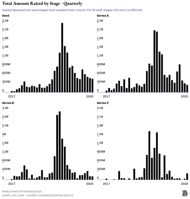 6年間、私はこれらのデータを追跡してきましたが、同じ結論に達しています:リスク資金調達はますます困難になるでしょう。市場の熱狂は最初は人材や利用可能な資本を引き寄せますが、市場の効率性によって、時間が経つにつれて物事はますます困難になることが決まっています。2018年には「ブロックチェーン」となることで資金調達ができましたが、2025年にはプロジェクトの収益性や製品と市場の適合性に焦点を当て始めます。