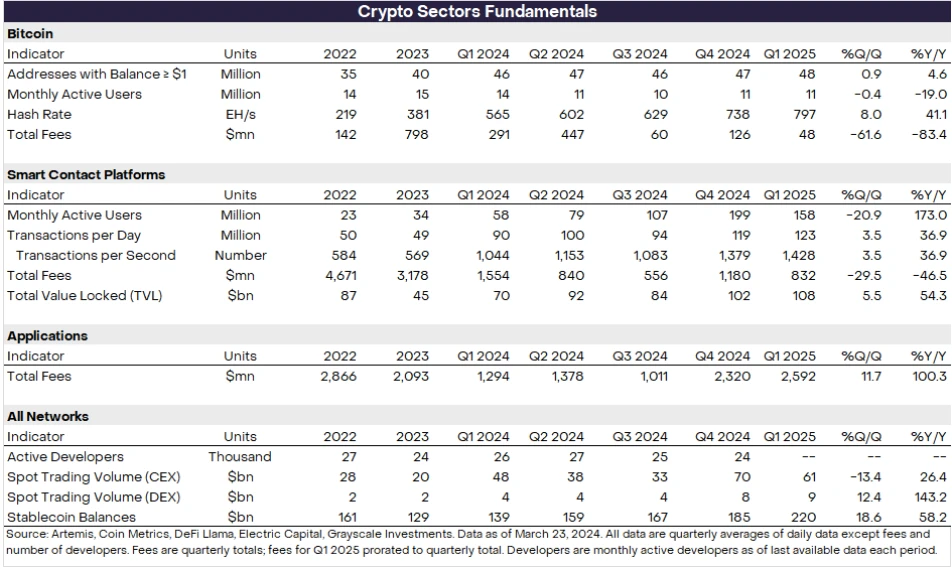 以下のチャートは、デジタル資産市場の各セグメントの主要なファンダメンタルズ統計の一部を示しています。 全体として、これらの指標は前年同期比で堅調な成長を示しましたが、前四半期と比較すると変化はまちまちでした。
