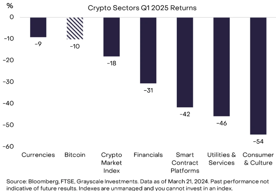 暗号通貨の評価は、2025年第一四半期にテクノロジー株やその他のリスク資産と同様に全面的に下落しました。この四半期(3月21日金曜日現在)、全業界の時価総額加重暗号通貨業界価格指数は18%下落しましたが、ビットコインや他のいくつかの暗号通貨は下落幅が小さいか、価格が上昇しています(例えばXRP)。この四半期で最も弱いセグメントは消費者と文化で、主にDOGEや他のMemeコインの価格下落によるものです。