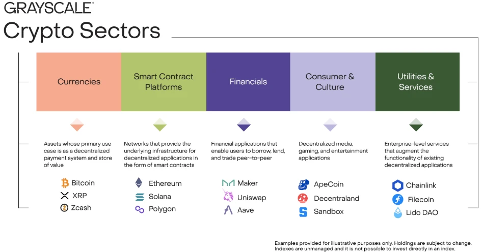 現在、デジタル資産業界には、NFTを除いて4000万以上のトークンがあります。それらを追跡するために、Grayscale Researchは、基盤となるソフトウェアの実際の使用状況に基づいて、5つの異なる暗号通貨市場に分類しました。投資家は、GrayscaleのCrypto Sectorsツールを使用して、各セグメント市場のパフォーマンスを監視できます。最新のデータによると、Crypto Sectorsフレームワークは227種類の異なる資産をカバーしており、総時価総額は2.6兆ドルで、暗号通貨全体の時価総額の約85〜90%を占めています。
