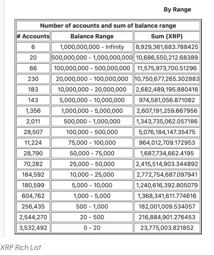 XRPコミュニティのメンバーが共有した画像は、XRPの所有権がどのように分配されているか、そして価格上昇に伴いリテール参加者にとって何を意味するかを説明しています。 この画像は、しばしば「XRPリッチリスト」と呼ばれ、ウォレットの残高範囲ごとに数を分解しています。ひとつ目立つ数字はすぐにわかります:600万以上のXRPウォレットが500XRP以下を保有しています。同時に、大きなポジションを蓄積するコストが明らかに高くなっています。1,000XRPを保有するのに今は約1,750ドルかかりますが、これは約$500 一年前と比べてです。 この変化は、リテール投資家が徐々に価格から排除されつつあるのではないかという議論をXRPコミュニティ内で引き起こしています。