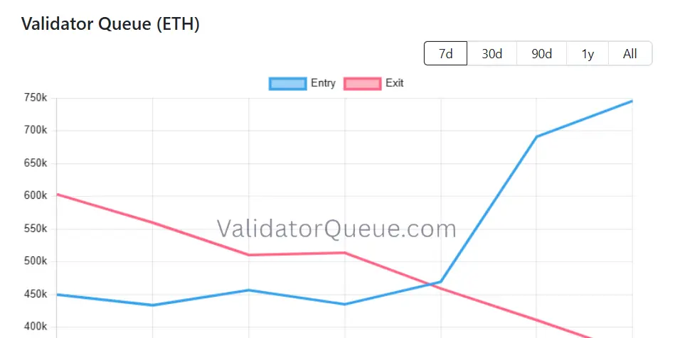 The entry queue for validators has roughly 745,619 Ether (ETH) with a nearly 13-day wait, while the exit line has around 360,518 ETH and an eight-day wait, according to the blockchain explorer Ethereum Validator Queue.