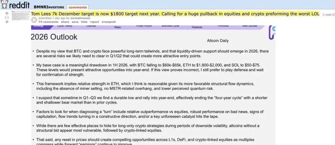 The bearish prediction came as a surprise to investors, considering Lee is also the chairman of Bitmine, the largest corporate Ether holder with around $12.3 billion in ETH holdings.