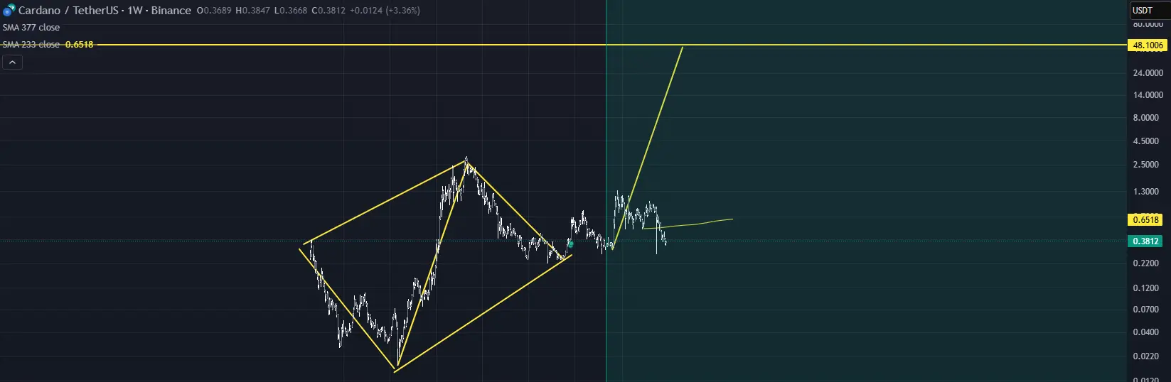 For context, the analyst noted that Cardano’s all-time chart formed a diamond bottom pattern. The weekly chart analysis shows that the coin has been trending within this diamond-shaped structure since April 2018.