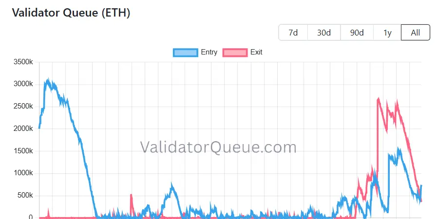 When the exit queue is larger, it signals that validators are looking to withdraw their Ether, potentially positioning to sell their holdings.