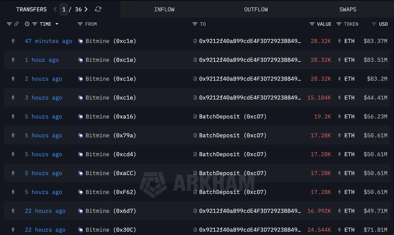 BitMine Immersion Technologies, the largest corporate Ether (ETH) holder, staked 342,560 ETH worth over $1 billion in the two days leading up to Sunday, according to blockchain data platform Lookonchain.