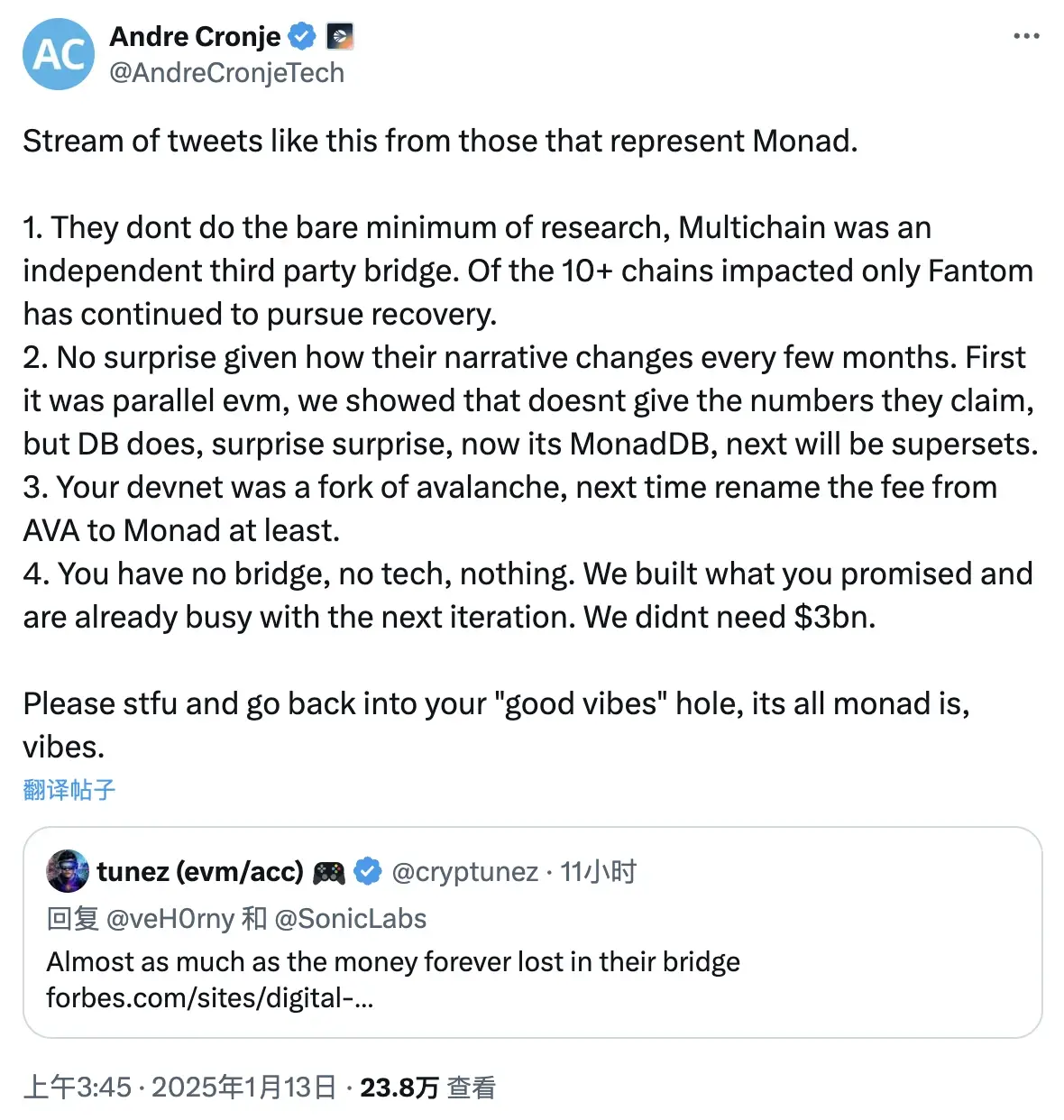 Several Sonic community members began retaliating against Tunez, with some even recalling his words from two days earlier: “As Monad becomes more popular, it will also face more attacks,” implying that Tunez’s remark was provoked by Sonic’s rising popularity.