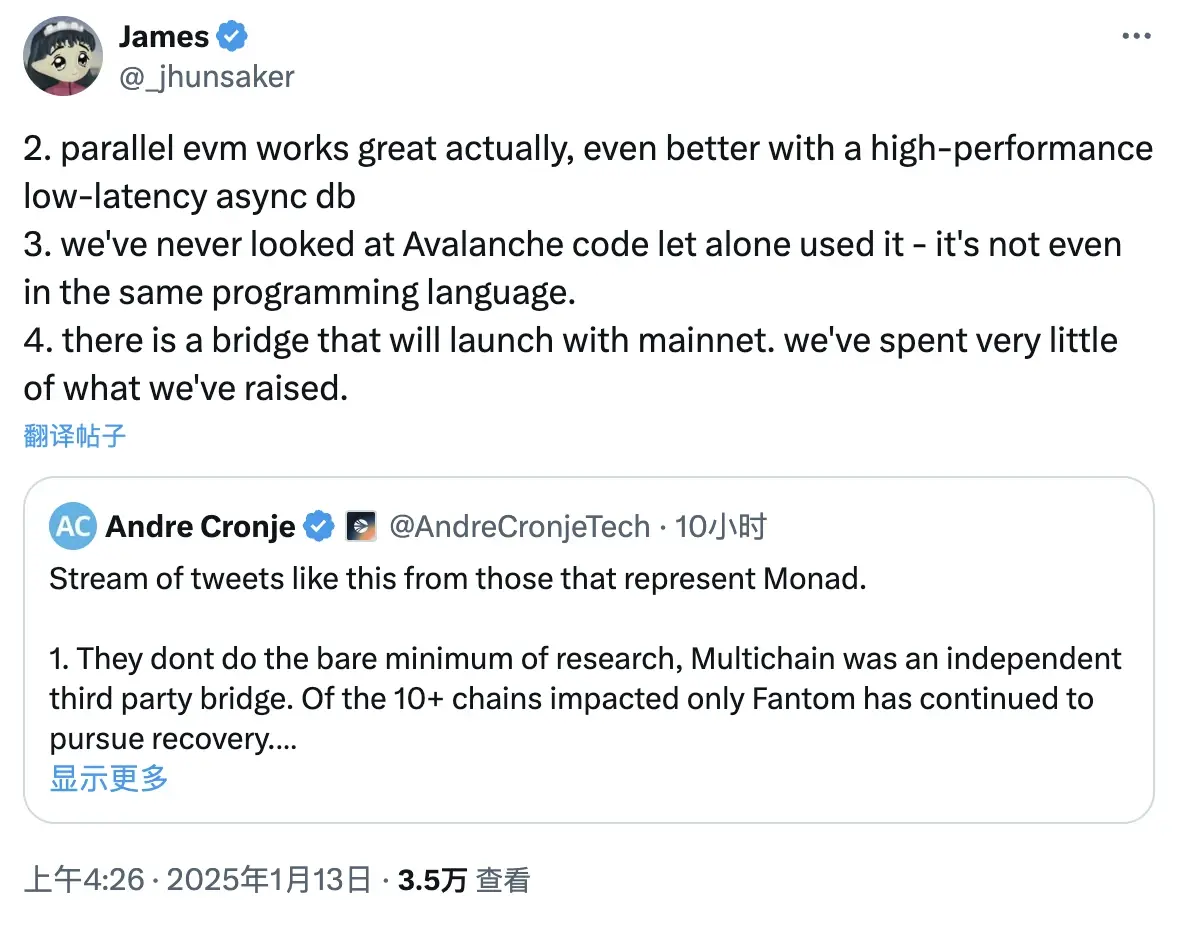After AC’s response, Monad’s co-founders Keone Hon and James Hunsaker also responded, but perhaps feeling that Tunez’s provocation was unjustified, their tone was much more peaceful and did not further escalate the conflict.