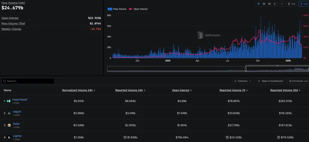 主要なperp-DEXは自信を持ってリーダーシップを維持し、edgeX、Aster、Lighterなどの競合を大きく引き離しています。