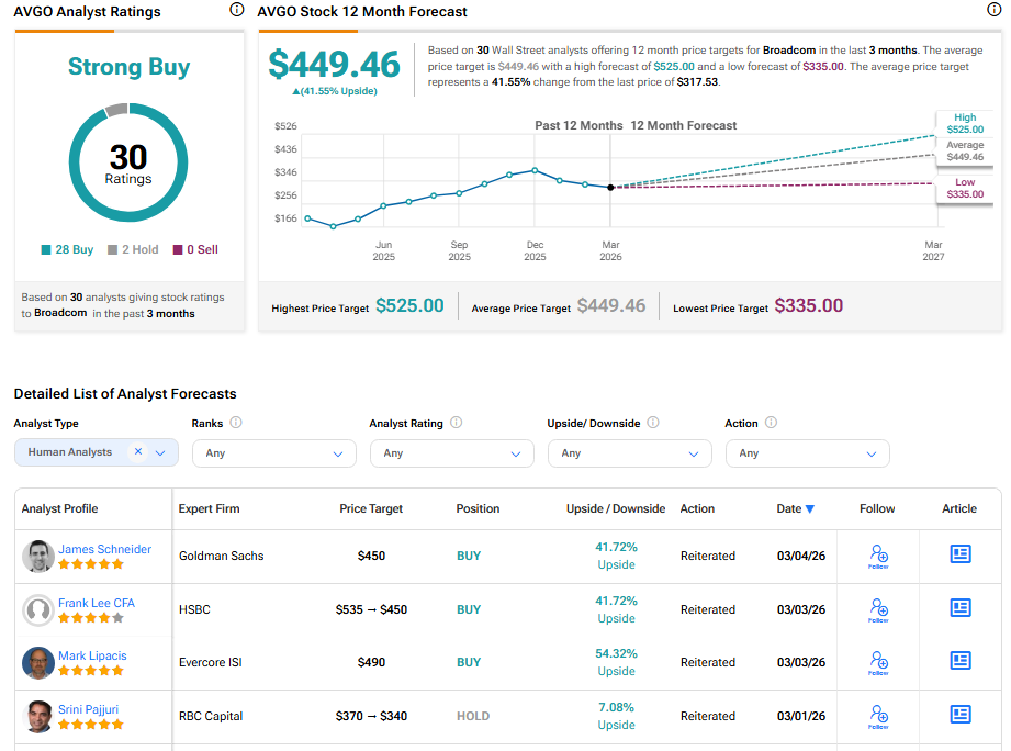 Broadcom’s stock has a consensus Strong Buy rating among 30 Wall Street analysts. That rating is based on 28 Buy and two Hold recommendations issued in the last three months. The average AVGO price target of $449.46 implies 41.55% upside from current levels. These ratings might change after the company’s financial results.