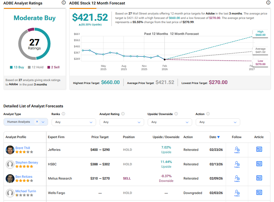 Adobe’s stock has a consensus Moderate Buy rating among 27 Wall Street analysts. That rating is based on 13 Buy, 12 Hold, and two Sell recommendations issued in the last three months. The average ADBE price target of $421.52 implies 56% upside from current levels.