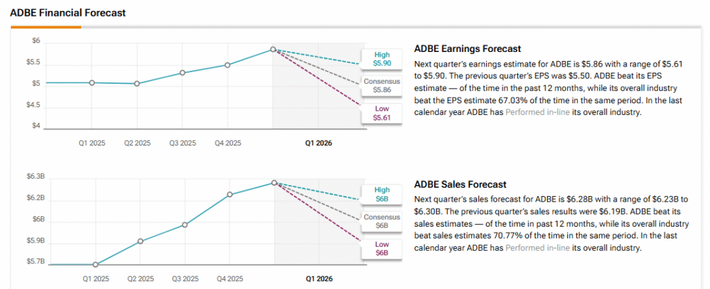 As Adobe is expected to report its results soon, Wall Street analysts expect earnings of $5.86 per share in Q1 FY26, up from $5.08 in the year-ago quarter. Meanwhile, revenue is projected at about $6.28 billion, representing a 10% year-over-year increase.