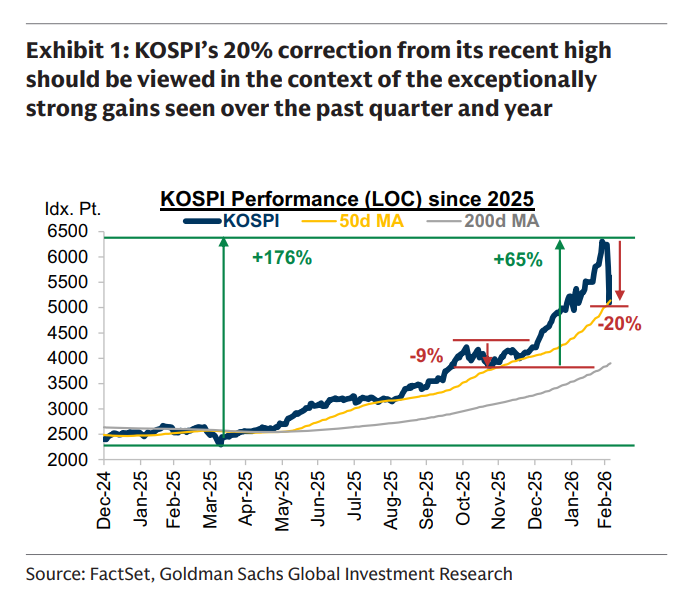 Goldman Sachs states that considering the astonishing 176% rise in Korean stocks since April 2025, the current decline is merely a “delayed correction,” not the start of a bear market. The Korean stock market will not only recover but will also hit new highs after consolidation.