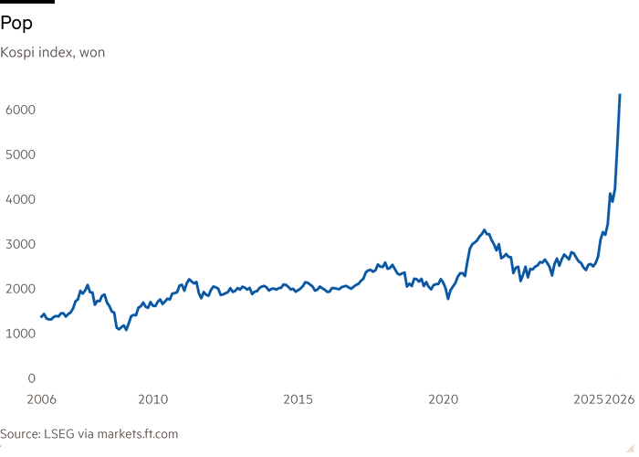 The Kospi is up 50 per cent in two months and 150 per cent in the past year. I can’t think of another major stock market that had ever risen that fast. And before this glorious summer, the winter was long: Jim Reid of Deutsche Bank notes that in inflation-adjusted terms the Kospi returned to its 1989 high only last September. The run is backed by good economic growth, corporate governance reform and overwhelming exposure to the semiconductor industry — Samsung and SK Hynix account for half the market (Unhedged discussed all three factors back in November).