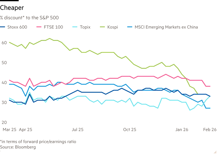 Emerging market stocks have given up much of their valuation edge, but the discounts for Europe (Stoxx 600) the UK (FTSE 100) and Japan (Topix) have remained wide and fairly stable, while the emerging market discount has tightened some. This looks like a rebalancing opportunity for long-term investors — particularly those who believe the rotation away from tech and towards “old” industries, driven by AI, is for real. The S&P 500 is still a third tech. The Stoxx 600, for example, is 7 per cent tech, and its biggest sectors are industrials and healthcare. As my colleague Leo Lewis recently pointed out, Japan is crammed with AI-resilient stocks, too.