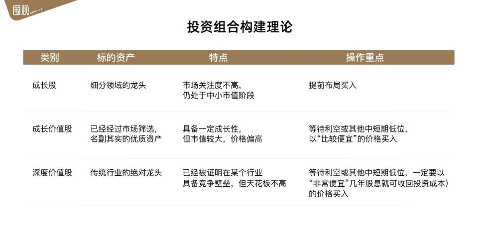 One strategy is to build a护城河 with组合. For example, Chongyang senior strategist Tan Wei’s approach divides the market assets into growth stocks, growth value stocks, and deep value stocks, using价格 as the核心参考,逆势买入.