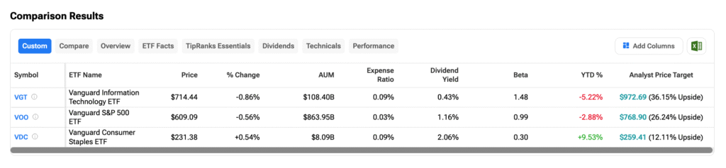 Investors looking to build a simple long-term portfolio often turn to Vanguard ETFs. But choosing the right one can make a meaningful difference in potential returns. Using the TipRanks’ ETF Comparison Tool, we have placed Vanguard S&P 500 ETF VOO -0.56% ▼ , Vanguard Information Technology ETF VGT -0.86% ▼ , and Vanguard Consumer Staples ETF VDC +0.54% ▲ against each other to find the best Vanguard ETF for the highest upside in 2026.