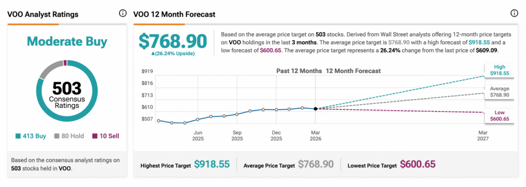 According to TipRanks’ unique ETF analyst consensus, determined based on a weighted average of analyst ratings on its holdings, VOO is a Moderate Buy. The Street’s average price target of $779.86 implies an upside of 27.32%. Currently, VOO’s top two holdings with the highest upside are Fair Isaac FICO +3.44% ▲ at 90% and Loews L -0.38% ▼ at 84.5%.