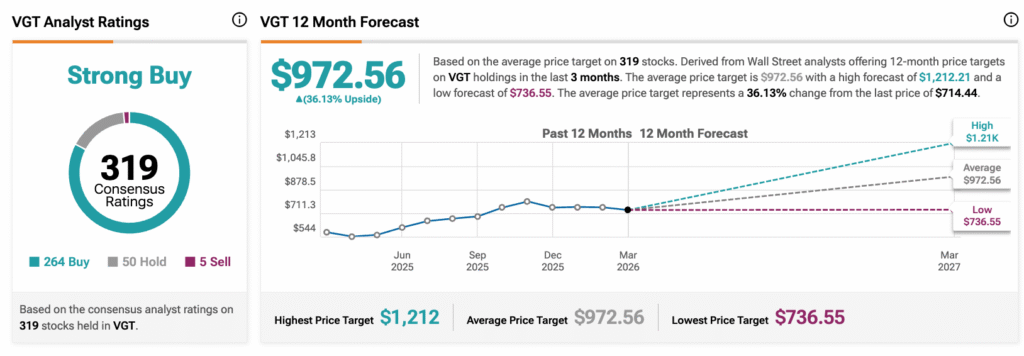 According to TipRanks’ unique ETF analyst consensus, determined based on a weighted average of analyst ratings on its holdings, VGT is a Strong Buy. The Street’s average price target of $991.70 implies an upside of 38%. Currently, VGT’s top two holdings with the highest upside are Expensify EXFY -0.91% ▼ at almost 300% and Powerfleet, Inc. AIOT +1.62% ▲ at 250%.