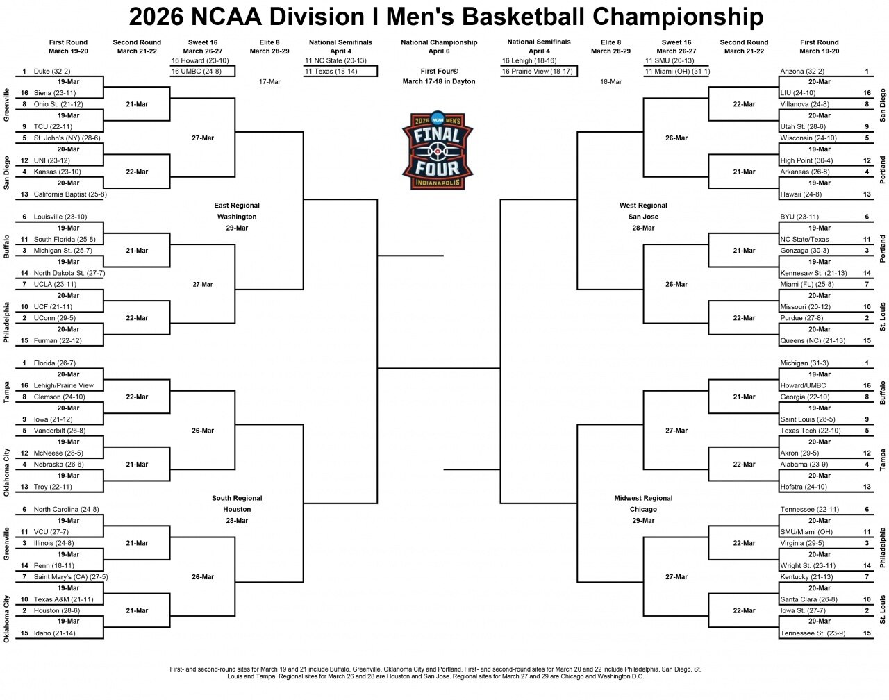 According to the schedule confirmed by yesterday’s draw, the 2026 “March Madness” will officially start on March 18 (tomorrow) Beijing time. The 68 college teams that qualified after months of regular-season battles will compete for the championship. The first round, called the First Four, will see 8 teams compete, with 4 eliminated, leaving 64 teams to advance through five rounds of single-elimination matches (Round of 64 → Round of 32 → Sweet 16 → Elite 8 → Final Four → Championship) to determine the winner.