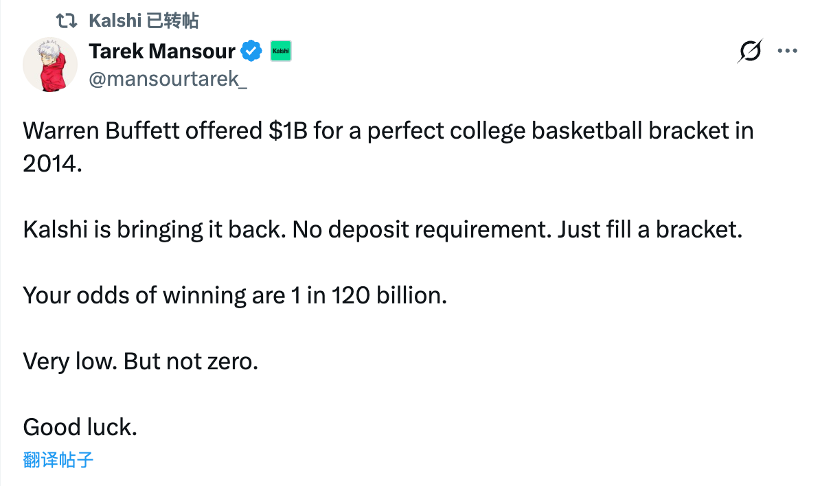 Early morning on March 17, prediction market Kalshi announced on X that it will follow the example of Warren Buffett, the stock market legend, by launching the “Perfect Bracket Challenge” for the upcoming NCAA “March Madness” tournament — users who predict all match outcomes perfectly will win a super grand prize of $1 billion.