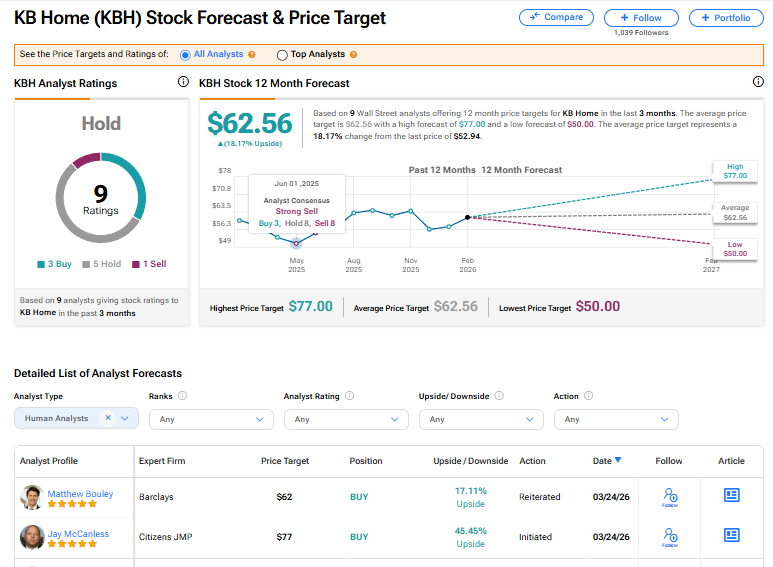 KB Home stock has a consensus Hold rating among nine analysts. That rating is based on three Buy, five Hold, and one Sell recommendations issued in the last three months. The average KBH price target of $62.56 implies 18% upside from current levels. These ratings could change after the company’s financial results.
