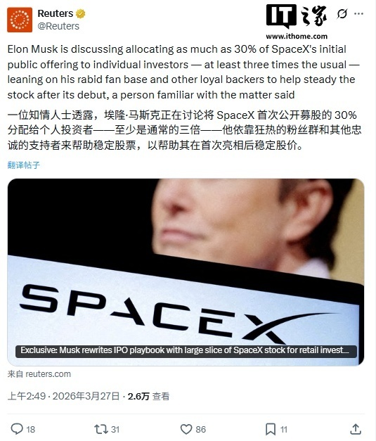 IT Home, March 27 — According to Reuters today, Musk is considering allocating up to 30% of SpaceX’s IPO shares to individual investors.