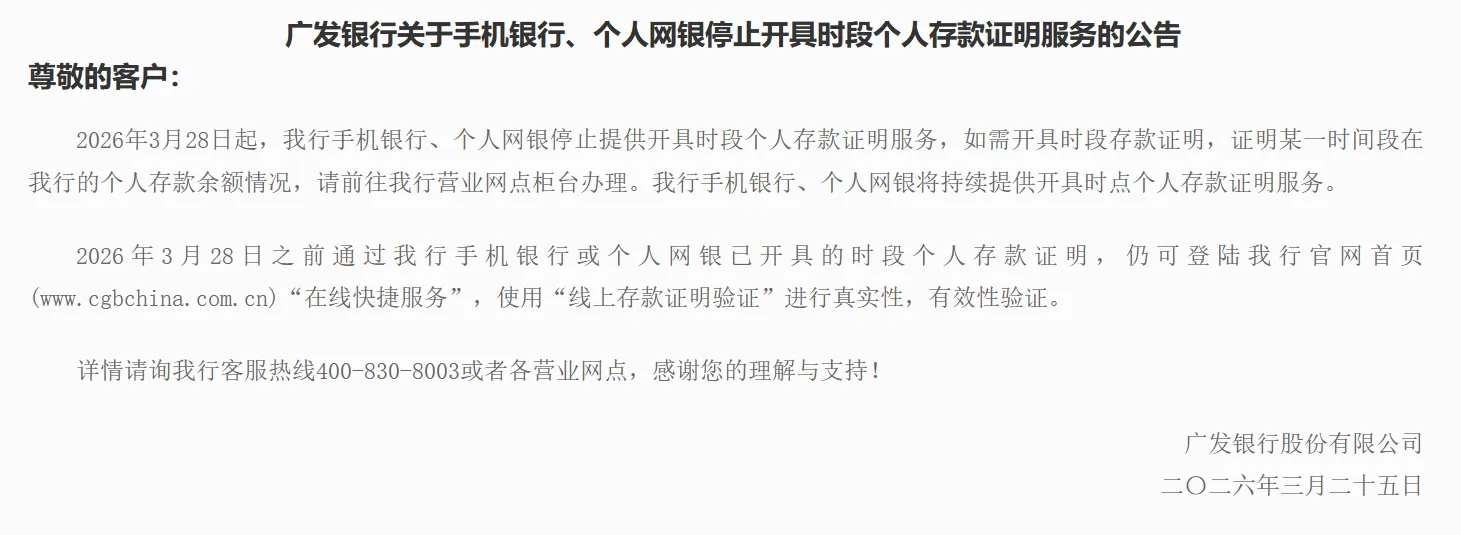 Guangfa Bank: Starting from March 28, the mobile banking and personal online banking services will no longer provide the issuance of time-specific personal deposit certificate services.