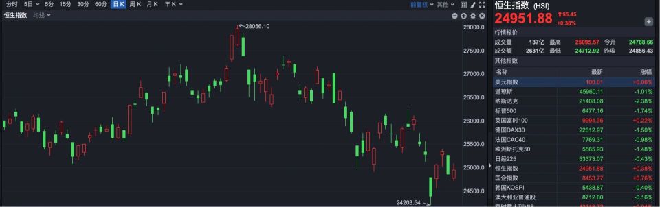 As of the close, the Hang Seng Index stood at 24,951.88 points, up 95.45 points, a rise of 0.38%.
