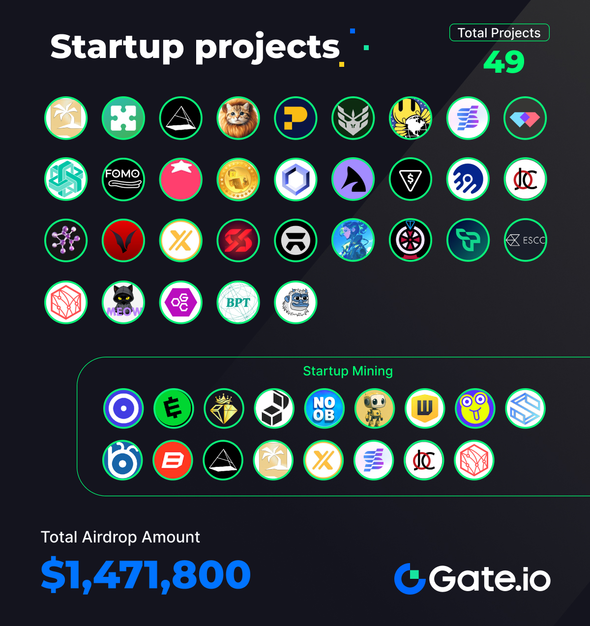 De 16 de dezembro a 31 de dezembro de 2024, a Gate lançou 32 novos projetos e 49 projetos Startup com um valor total de airdrop de $1,471,800.