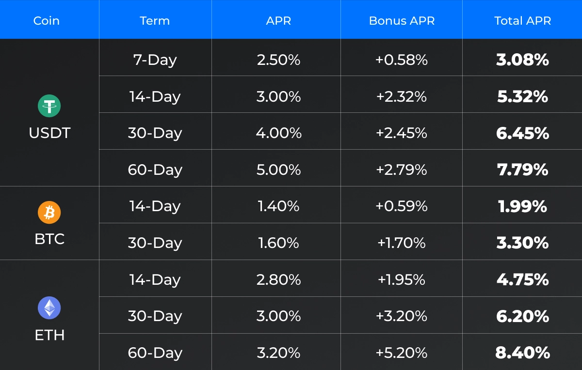 Regras de ganhos de produto a prazo: Uma vez que um utilizador cria uma ordem para um produto a prazo fixo, a taxa APR permanece fixa ao longo do prazo. Os juros começarão a acumular às 00:00 (UTC) no dia seguinte à subscrição, e tanto os juros como o principal serão resgatados para a conta spot ou a conta unificada no final do prazo.