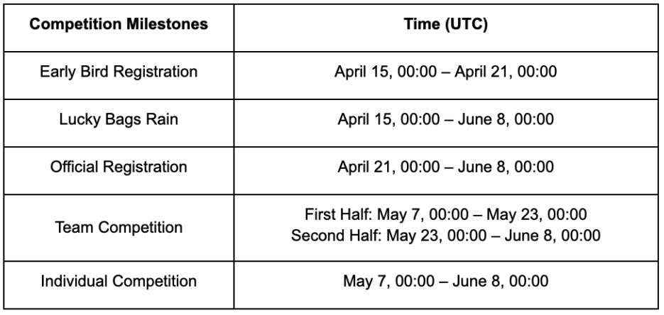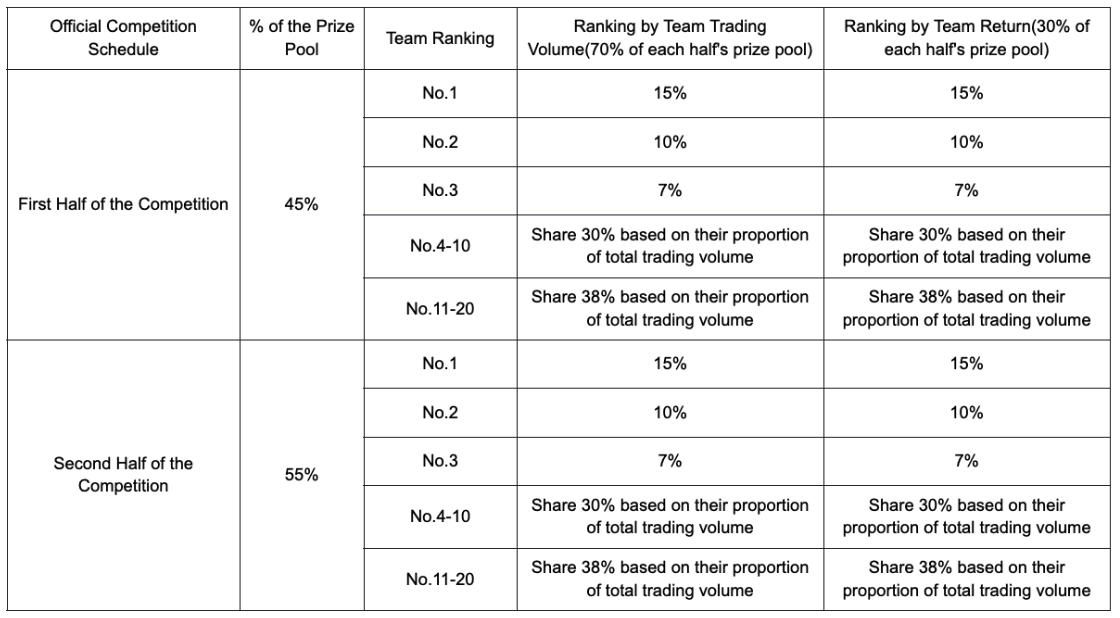 Durante o evento, as equipes participantes da Competição de Equipes competirãão ferozmente em duas etapas (cada uma com duração de duas semanas — a primeira metade e a segunda metade), com base no volume total de negociação da equipe e no retorno geral da equipe. Em cada etapa, as 20 melhores equipes serão classificadas e recompensadas. Uma única equipe pode competir em ambas as etapas. As classificações e os dados de desempenho serão reiniciados no final de cada etapa. As regras detalhadas de recompensa são as seguintes:
