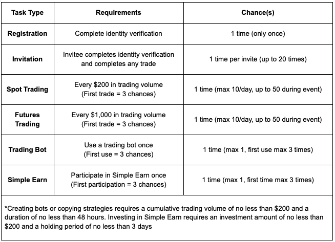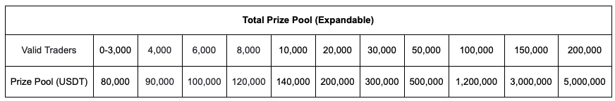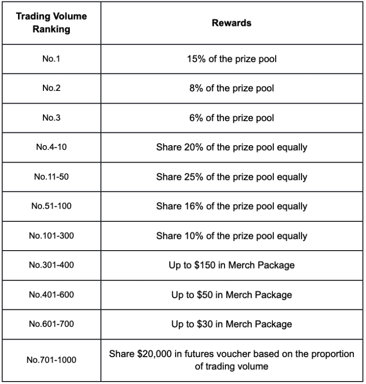 Durante a competição, os usuários com um volume de negociação acumulado de pelo menos $50.000 serão classificados com base em seu volume total de negociação. Os melhores desempenhos compartilharão um prêmio de até $1.000.000 USDT — quanto maior a classificação, maior a recompensa.