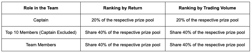 Com base na classificação de retorno de cada equipe e na classificação de volume de negociação em cada estágio, as equipes receberão uma parte correspondente do prêmio. As recompensas serão então distribuídas dentro da equipe de acordo com as seguintes regras:
