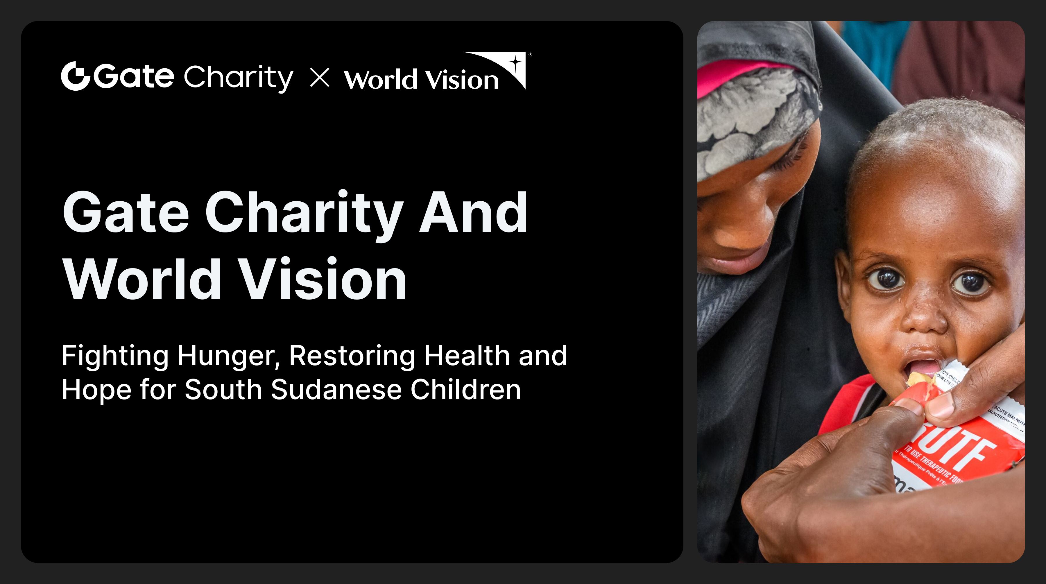 Em resposta aos problemas de fome e desnutrição infantil causados pela grave crise alimentar no Sudão do Sul, a Gate Charity associou-se à Visão Mundial para lançar o Projeto de Fome e Desnutrição Infantil no Sudão do Sul, fornecendo ajuda alimentar crítica, assistência médica e soluções de subsistência a longo prazo para crianças e famílias vulneráveis, com o objetivo de salvar vidas e restaurar a esperança onde é mais necessário.