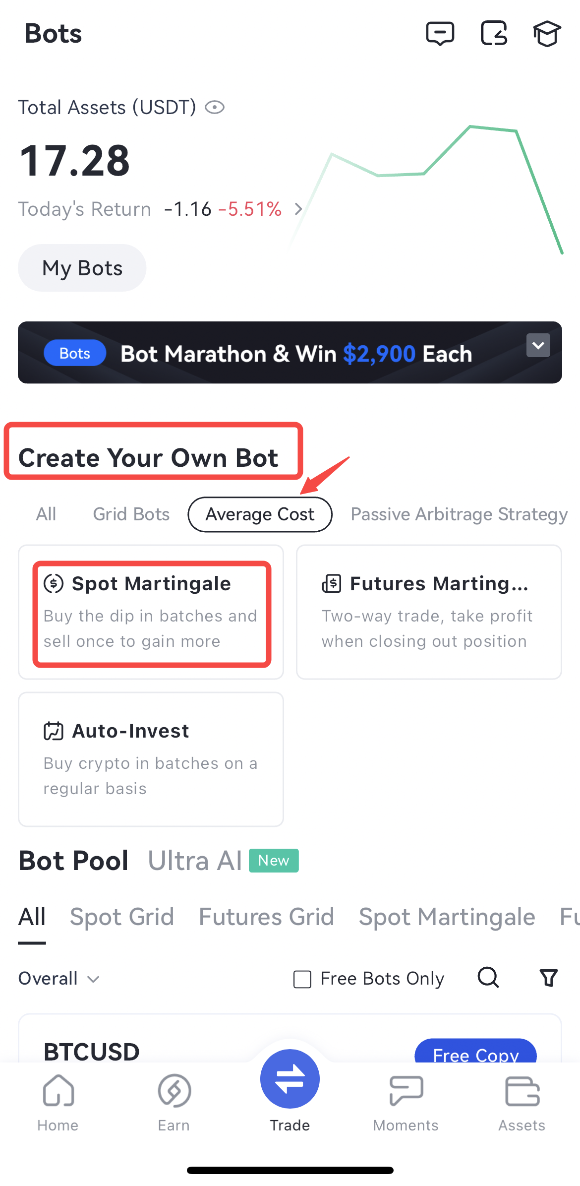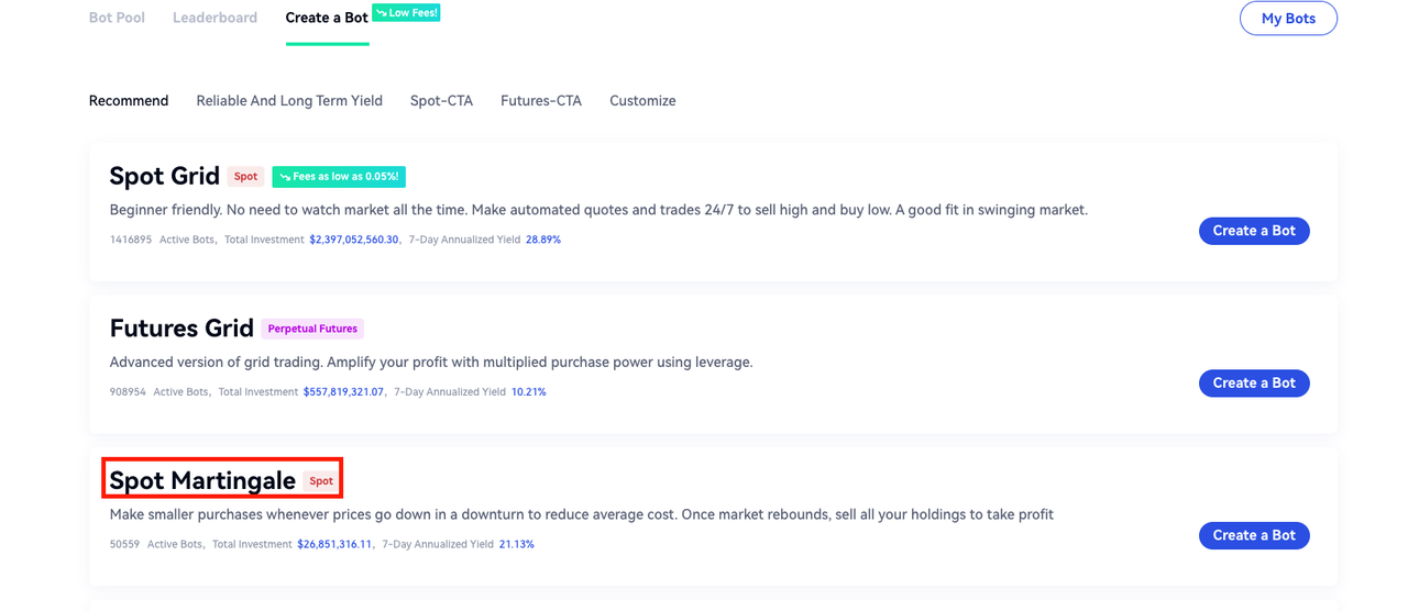 Se você acredita que uma criptomoeda específica vale a pena ser mantida e pensa que ela não ficará em um mercado unilateral por muito tempo, você pode escolher o Martingale Spot.