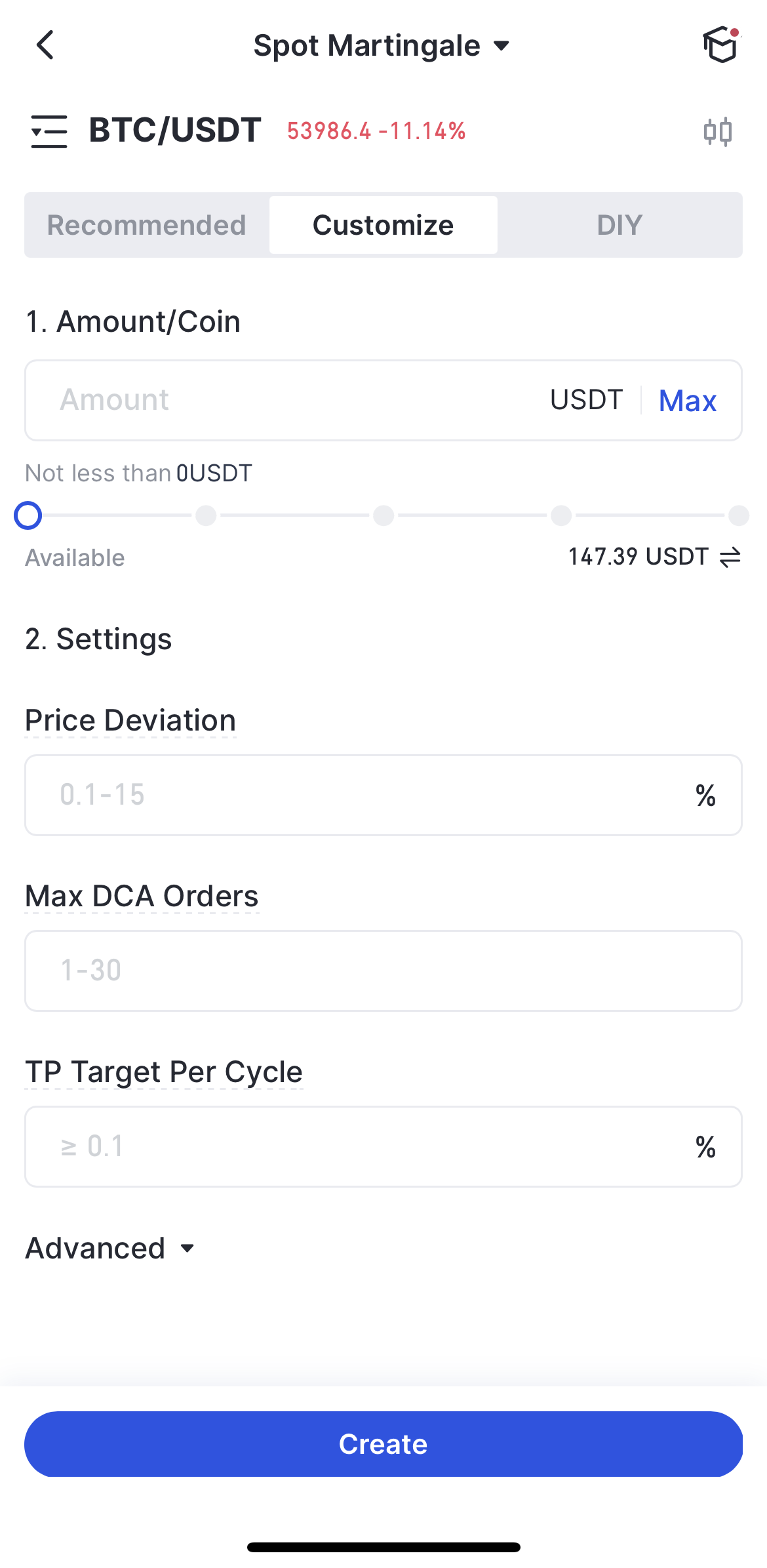 Dicas: Tokens de grande circulação são recomendados ao usar o Martingale Spot, pois têm mais chances de se recuperar após uma queda, evitando assim um grande drawdown.