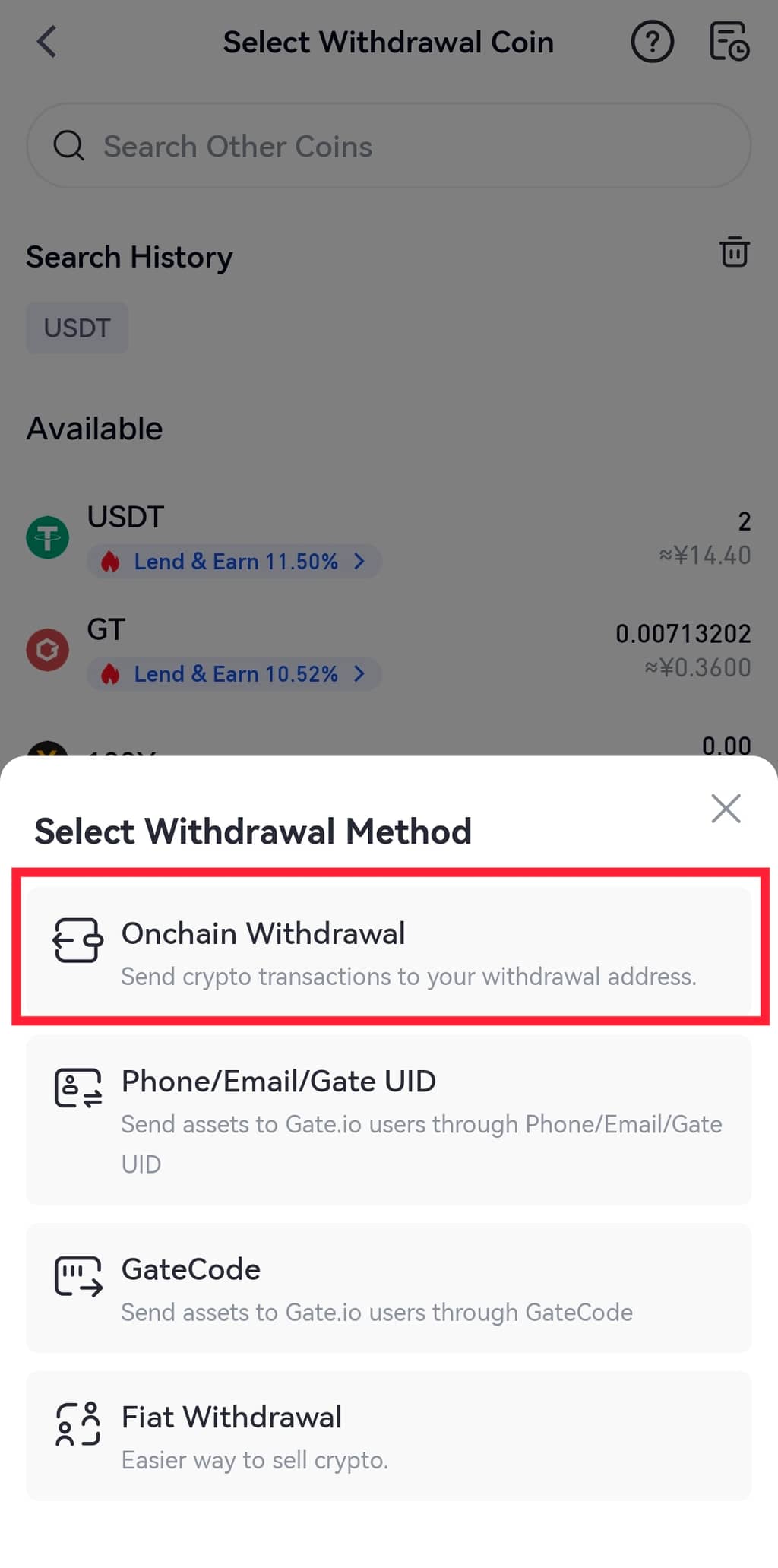 Passo 1: Abra o app Gate e faça login na sua conta. Vá para "Ativos" - "Saque" e selecione uma moeda.