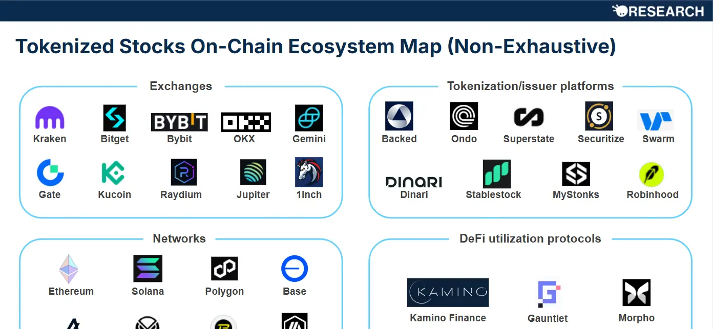 A pesquisa foca principalmente em ações públicas, deixando de fora empresas privadas ou outros produtos financeiros. Isso é importante porque outros projetos estão empurrando ações privadas para os trilhos de varejo. Por exemplo, uma plataforma de negociação descentralizada recentemente integrou ações tokenizadas pré-IPO à sua plataforma através de uma parceria com outra plataforma, permitindo que os usuários negociem tokens vinculados a nomes como SpaceX, OpenAI e Anthropic na Solana.