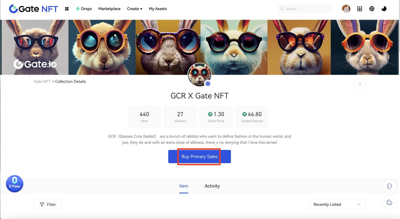 Etapa 3: Na página de exibição da coleção do projeto em que você está interessado, clique em “Comprar venda primária” para entrar na página de detalhes do ativo.