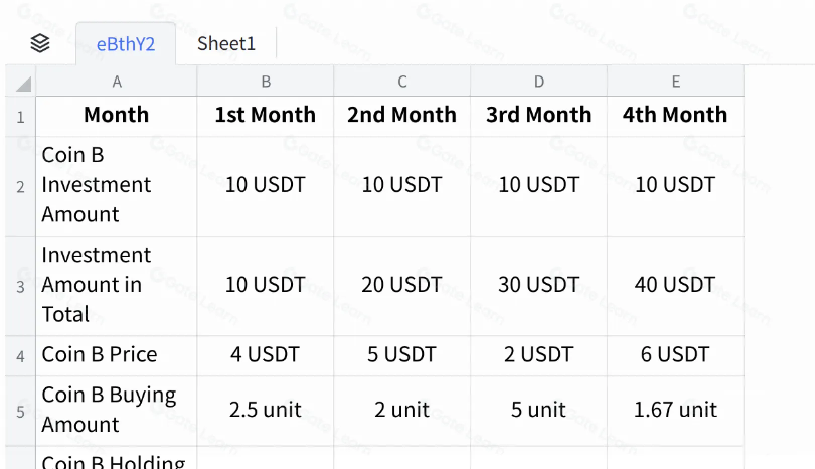 Tal como ilustrado na tabela abaixo, um DCA mensal de 10 USDT é utilizado para adquirir a moeda B. Com a subida do preço, a quantidade comprada diminui; com a descida, aumenta. Apesar de poderem ocorrer perdas em períodos de baixa, os investidores beneficiam de maiores retornos em fases de valorização graças ao reforço de posições.