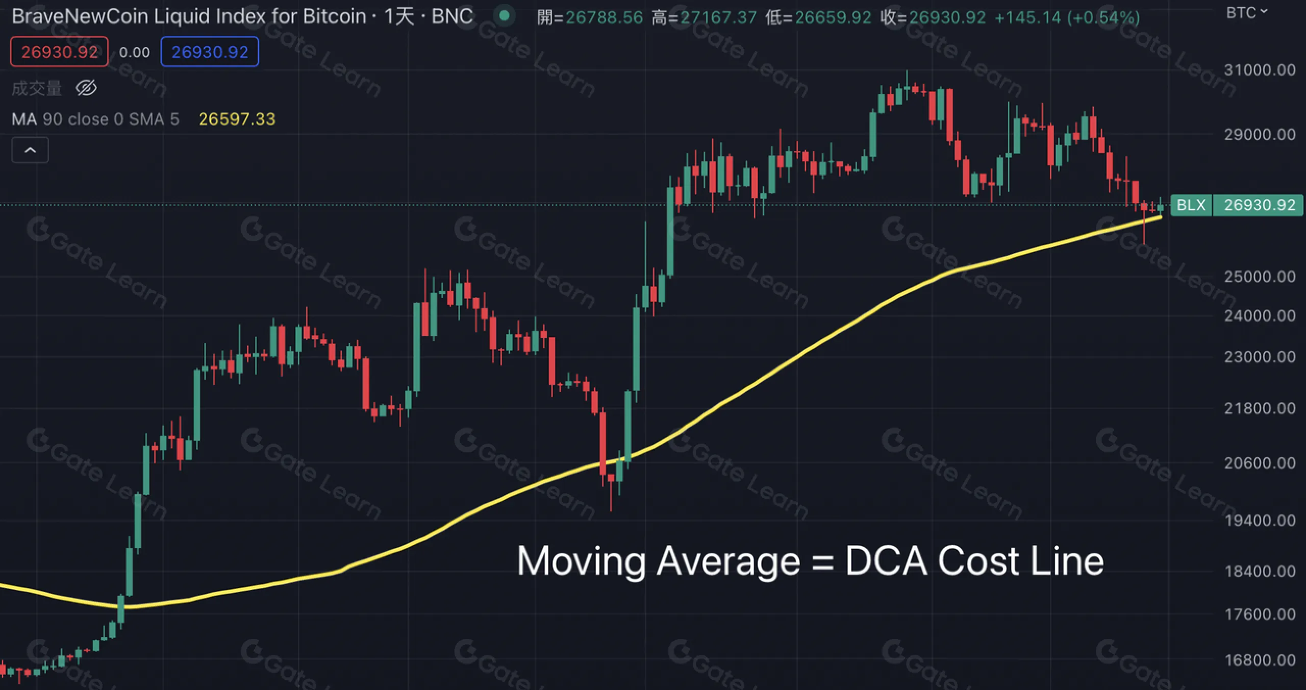 Com um número adequado de períodos de investimento, é possível demonstrar que a linha de custo de uma estratégia de auto-investimento se aproxima da média móvel do preço do ativo. Por exemplo, ao investir de forma regular numa criptomoeda durante 30 dias consecutivos, o custo médio das posições aproxima-se da média móvel dos últimos 30 dias.