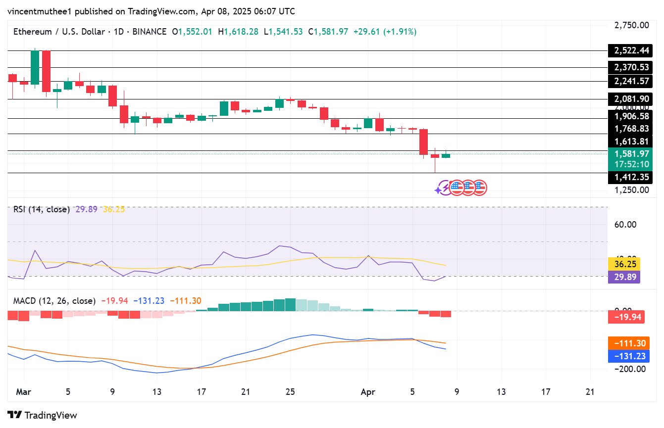 De acordo com o gráfico diário no TradingView, o ETH está a ser negociado a $1,581.97 no momento em que escrevo. Este nível de preço retrata um modesto aumento desde que caiu para o nível de $1,400 ontem. No entanto, apesar de enfrentar um possível ressurgimento acima de $1,600, o Ethereum parece ter encontrado resistência com os indicadores técnicos a sugerir sinais mistos.