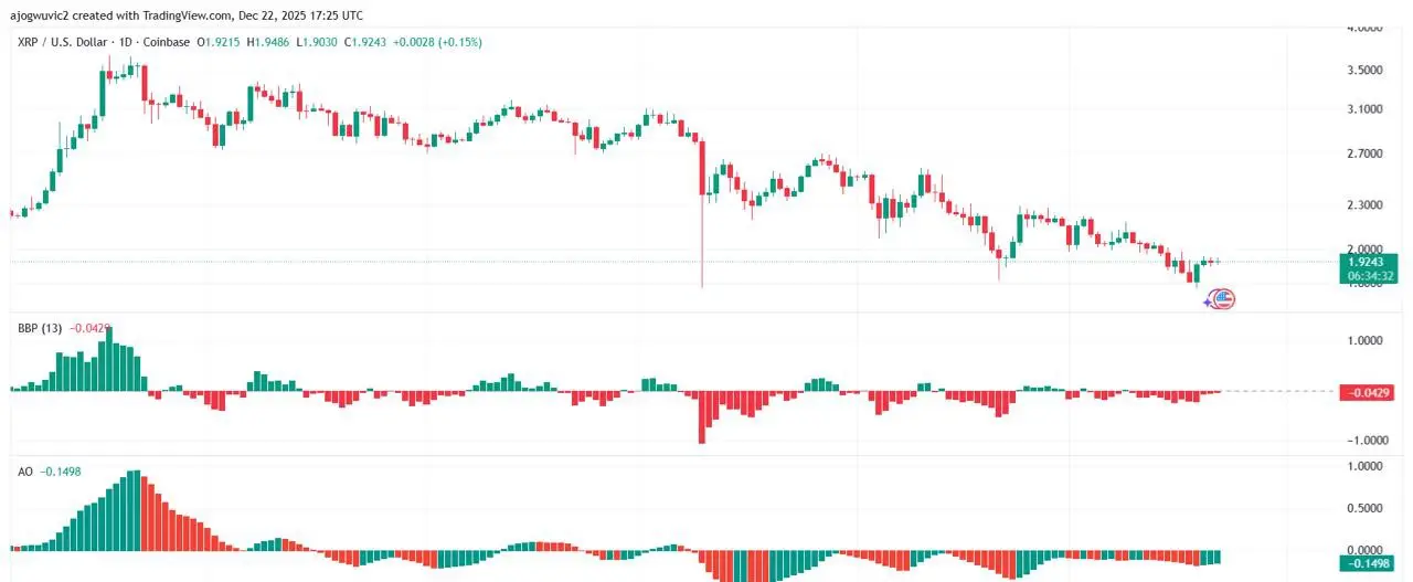 No gráfico diário, o XRP continua a negociar num canal descendente, caracterizado por mínimos e máximos mais baixos, um sinal importante de uma tendência de baixa sustentada. Além disso, os rallies de curto prazo têm sido consistentemente rejeitados perto do limite superior em $1.95, confirmando o controlo bajista.