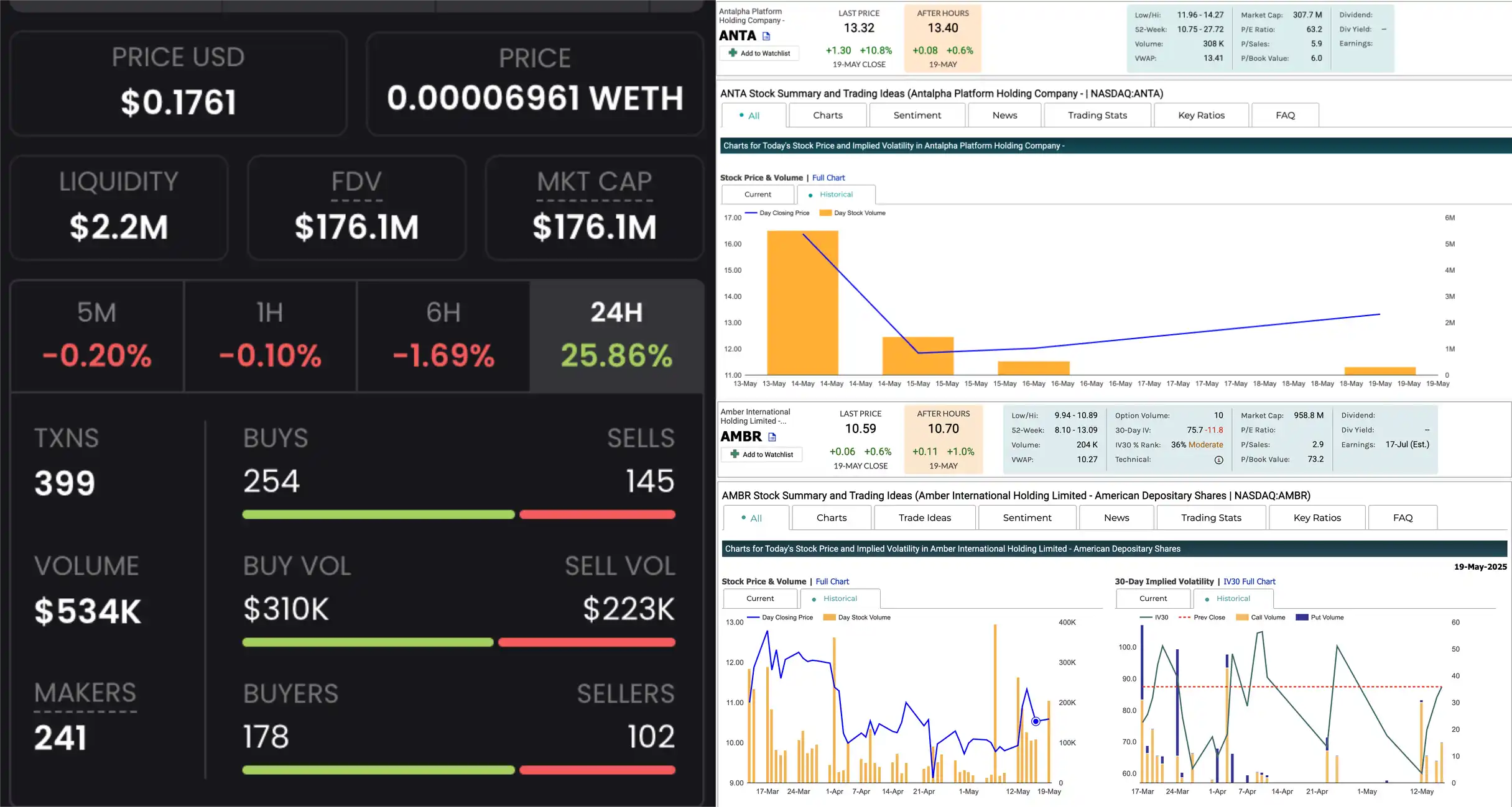 Данные взяты с marketchameleon и DexScreen, объемы торгов ANTA, AMBR и MIA составляют $308k, $204k и $534k соответственно.