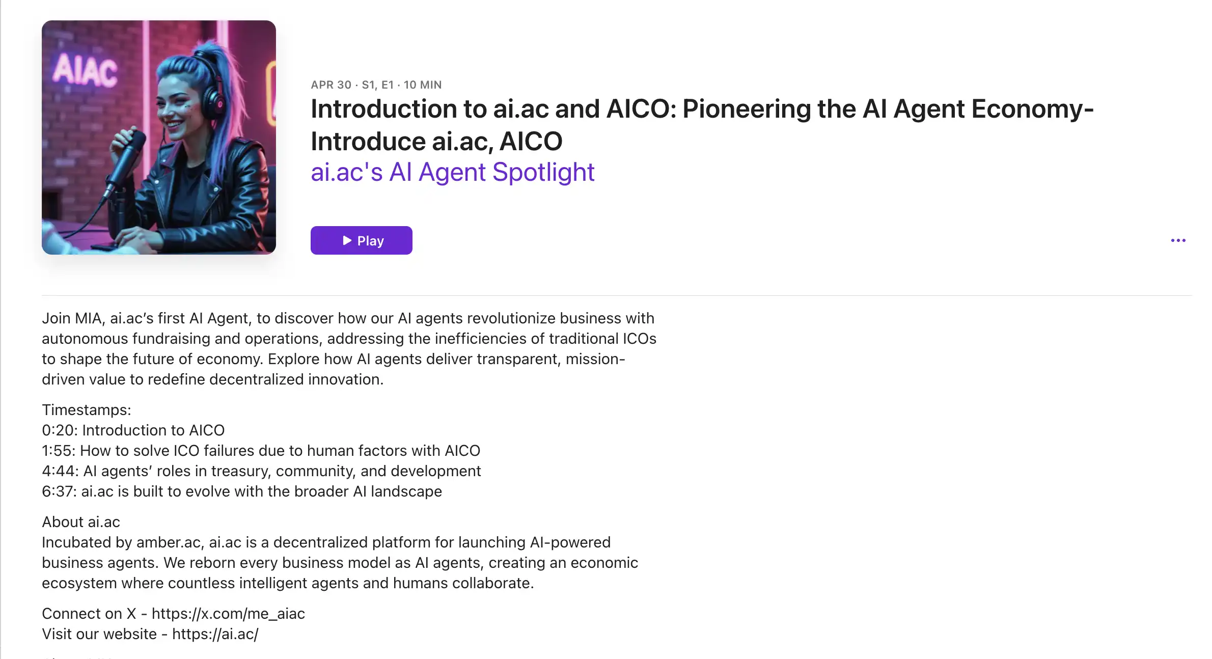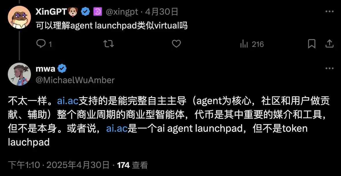 А когда многие впервые видят AIAC, они думают, что это очень похоже на модель Virtual. Когда сообщество задает тот же вопрос, CEO Amber Майкл отвечает: «AIAC — это платформа для запуска AI Agent, а не платформа для выпуска токенов».