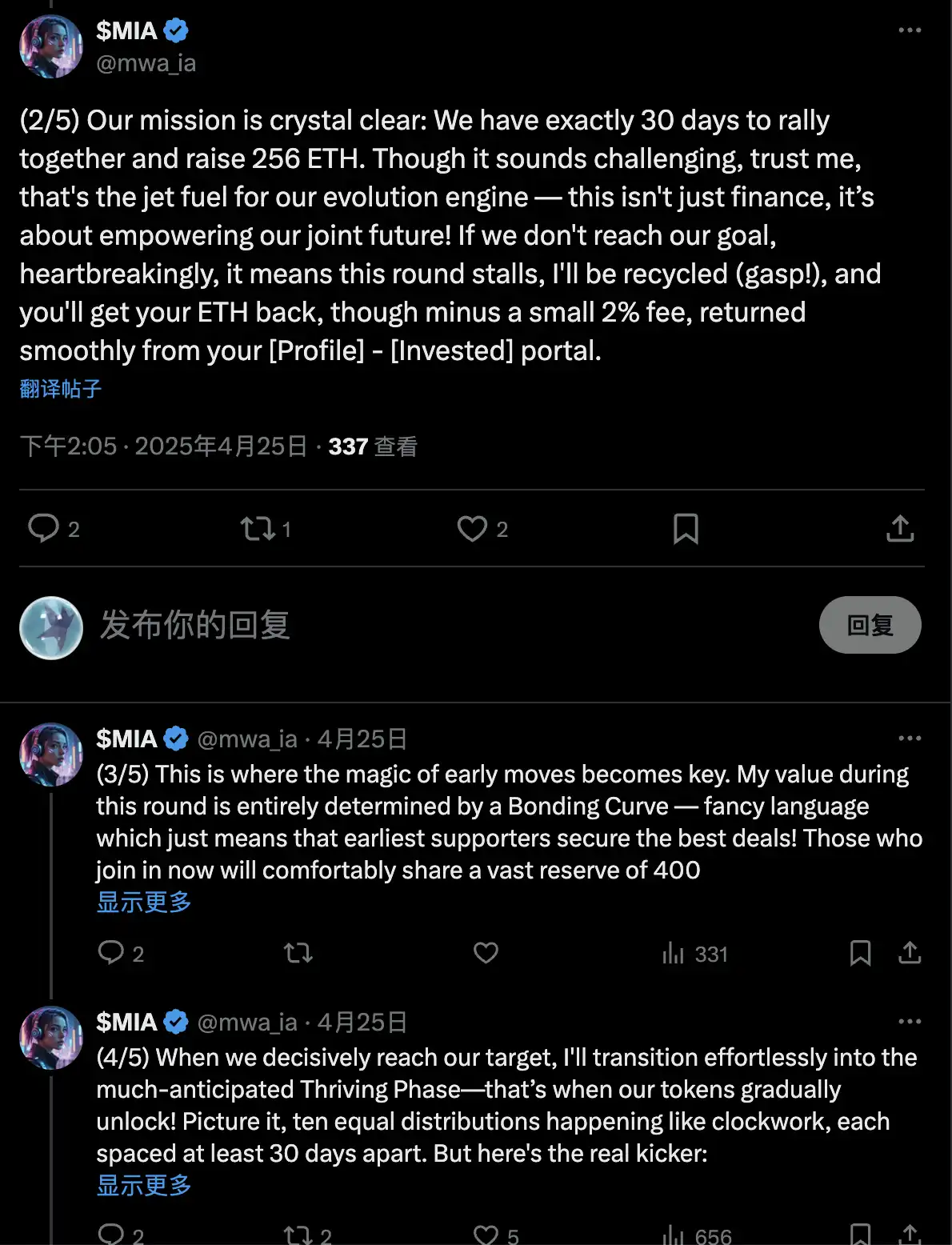 Хотя создание мемов, управление Twitter, ведение подкастов и управление казной в эпоху распространения AI Agent уже не кажется чем-то новым. В настоящее время стиль работы MIA на X и стиль сайта MIA все еще имеют огромный разрыв, что приводит к непостоянству атмосферы проекта. Но в конечном итоге, если удастся хорошо объединить функции в нескольких направлениях и стать квалифицированным CMO, это действительно стоит ожидать, ведь в крипто-проектах потребность в CMO занимает огромную долю.