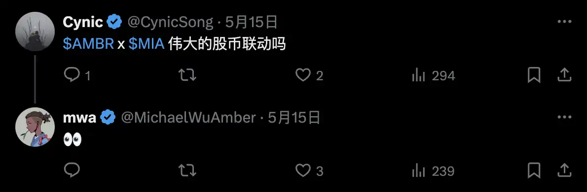 Когда сообщество обсуждало MIA, крипто KOL RUI «YeruiZhang» опубликовал пост с удивлением, что текущая рыночная капитализация Amber Group «AMBR» уже достигла тройной величины Antalpha, однако дневной объем торгов акциями составляет лишь треть от Antalpha. Более того, что еще более интересно, объем торгов и ликвидность AI проекта MIA «$MIA», запущенного Amber, даже превосходит саму акцию на главном фондовом рынке США, став «точкой высокой ликвидности» в нарративе Amber Capital.