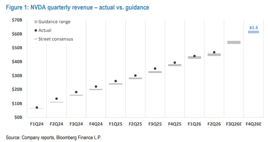 Джей Пи Морган повысил прогноз выручки Nvidia за октябрьский квартал с 54,4 миллиарда долларов до 55 миллиардов долларов, а за январский квартал следующего года — с 61,2 миллиарда долларов до 63,1 миллиарда долларов. Аналитики отмечают, что достижение квартального роста в 8 миллиардов долларов за октябрьский и январский кварталы установит исторический рекорд для отрасли.